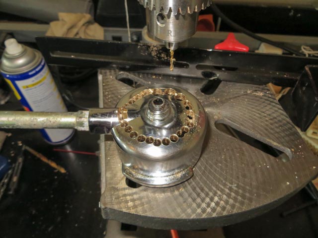To make this simpler / faster you can make a jig out of a piece of wood and a bolt though the spigot hole - this will allow you to drill, rotate, drill rotate and get all of the holes nicely lined up. I didn't do this, but really should have!
