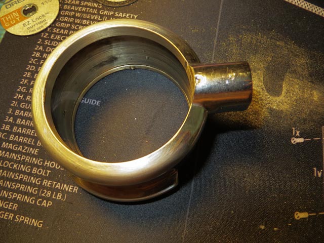 Now place the portafilter (without the metal handle!) on a lathe and machine away the excess material. I used a Central Machinery 7" X 10" Precision Mini Lathe. Something larger / more powerful would have made the process faster, but this worked ok. Running some fine sandpaper (on a dowel or similar) around the machined edge (while turning on the lathe) makes short work of tidying up the sharp edges, removing burrs and polishing the work.